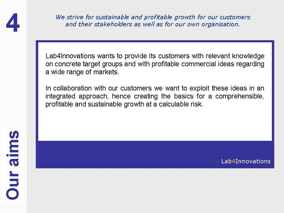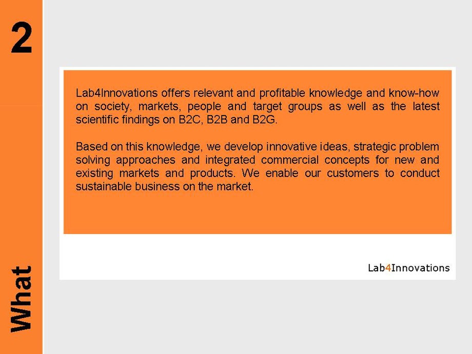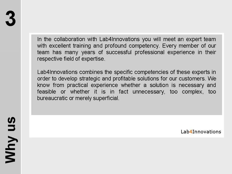 We at Lab4Innovations exercise and promote useful innovations within your entire company. Based on this foundation, your executive staff will be able to realise relevant changes in your existing business model in a more active way while also limiting incalculable risks.